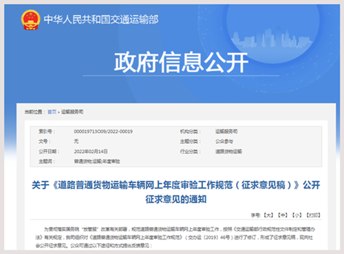 2019年交通运输部办公厅印发了《规范》,明确了道路普通货运车辆网上年审工作流程、工作要求、结果应用等内容,为 2019 年交通运输更贴近民生实事“实现普通货运车辆全国年审网上办理”提供了基本制度保障。