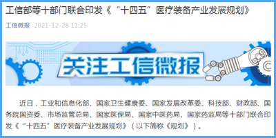 近日,工业和信息化部、国家卫生健康委、国家发展改革委、科技部、财政部、国务院国资委、市场监管总局、国家医保局、国家中医药局、国家药监局等十部门联合印发《“十四五”医疗装备产业发展规划》(以下简称《规划》)。