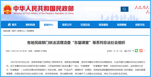 据民政部网站消息,2021年3月20日以来,各级民政部门持续深入贯彻党中央、国务院决策部署,坚持专项整治与常态化治理相结合,扎实开展打击整治非法社会组织工作。在打击整治非法社会组织专项行动期间,江苏省民政部门依法处置了一批以“东望课堂”“东望集团**课堂”为名的非法社会组织,这些组织大多与“东望集团”(公安机关查处的传销组织)存在关联。按照“打击必严、清理务尽”的原则,民政部迅速部署指导各地民政部门及时跟进,全面开展清理清查,共查处相关非法社会组织136家,其中取缔88家、责令解散48家,有力维护了人民群众合法权益,净化了社会组织生态空间。