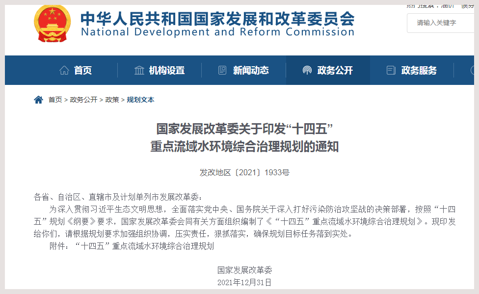 据国家发改委网站消息,按照“十四五”规划《纲要》要求,国家发展改革委会同有关方面组织编制了《“十四五”重点流域水环境综合治理规划》(以下简称《规划》)。